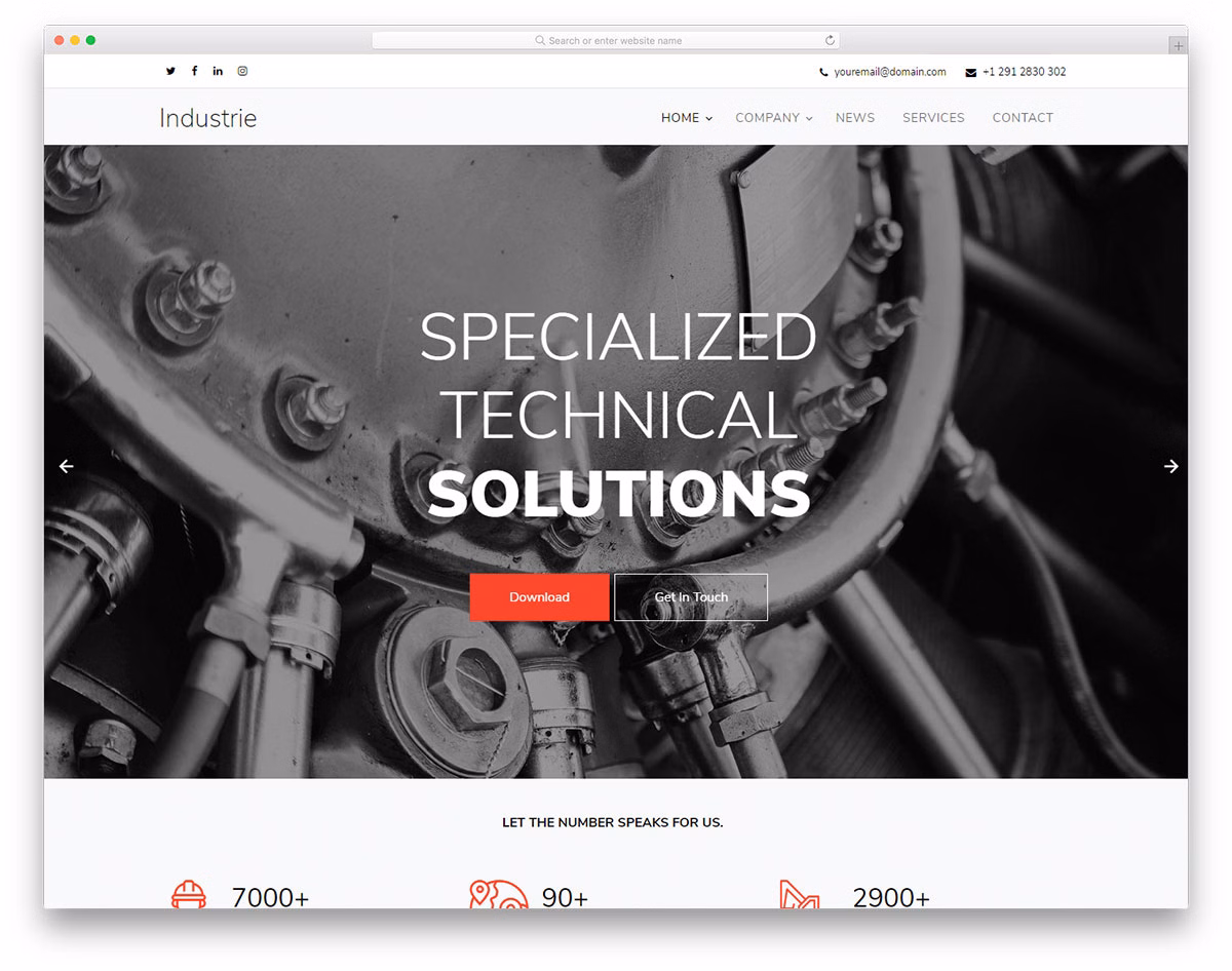 Industrie is your go-to tool, your best free industry website template for your flourishing company. If you are in oil and gas business, offer industrial construction, mechanical engineering or automated manufacturing, whatever the case, Industrie is here to get your firm on the web and grow it to the Moon. It has all the necessary material to boost your online presence and show your professionalism and expertness. Impress all and everyone that visits your website and increase the potential of winning them over with your refinement.