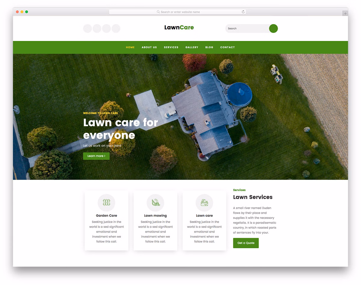 Moreover, there is still a whole lot more to Lawncare than just an attractive appearance. The design is responsive and fluid, adjusting to all devices seamlessly. It is also cross-browser compatible and retina-friendly. Other goodies include a parallax effect, social media icons, testimonials, and video support. Create a beautiful gallery, start a blog, and let those interested get in touch with you via the available and working contact form. In conclusion, Lawncare is the template you need for your lawn care business.