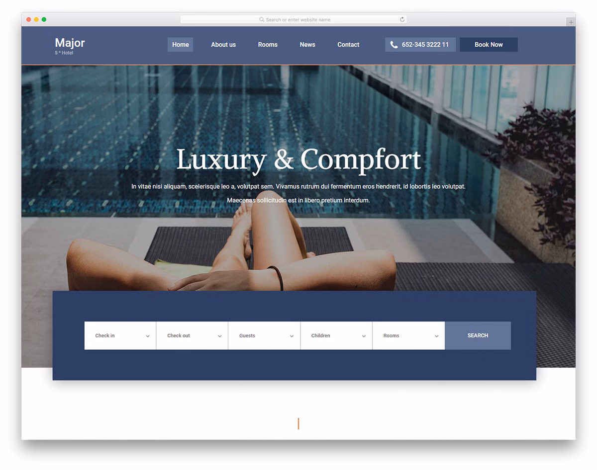 Major is a free luxury hotel website template with a stunning web design and remarkable performance. With Major, your outcome will never be half-baked rather striking and impressive, attracting new customers with all of its light. You are about to realize a business-driving website that will take your accommodations to an entirely new level. Luxury, boutique, 5-star, you name it, Major is here to adjust to all. Of course, you do not need to stick to the default parameters. In fact, you can freely customize Major to your needs and likings and have it represent your hotel in a professional, sophisticated and contemporary way. Even if they view it using a handheld device, Major makes sure that your rooms, bookings and other contents appear astonishingly. Are you ready to take your hotel to the next level?