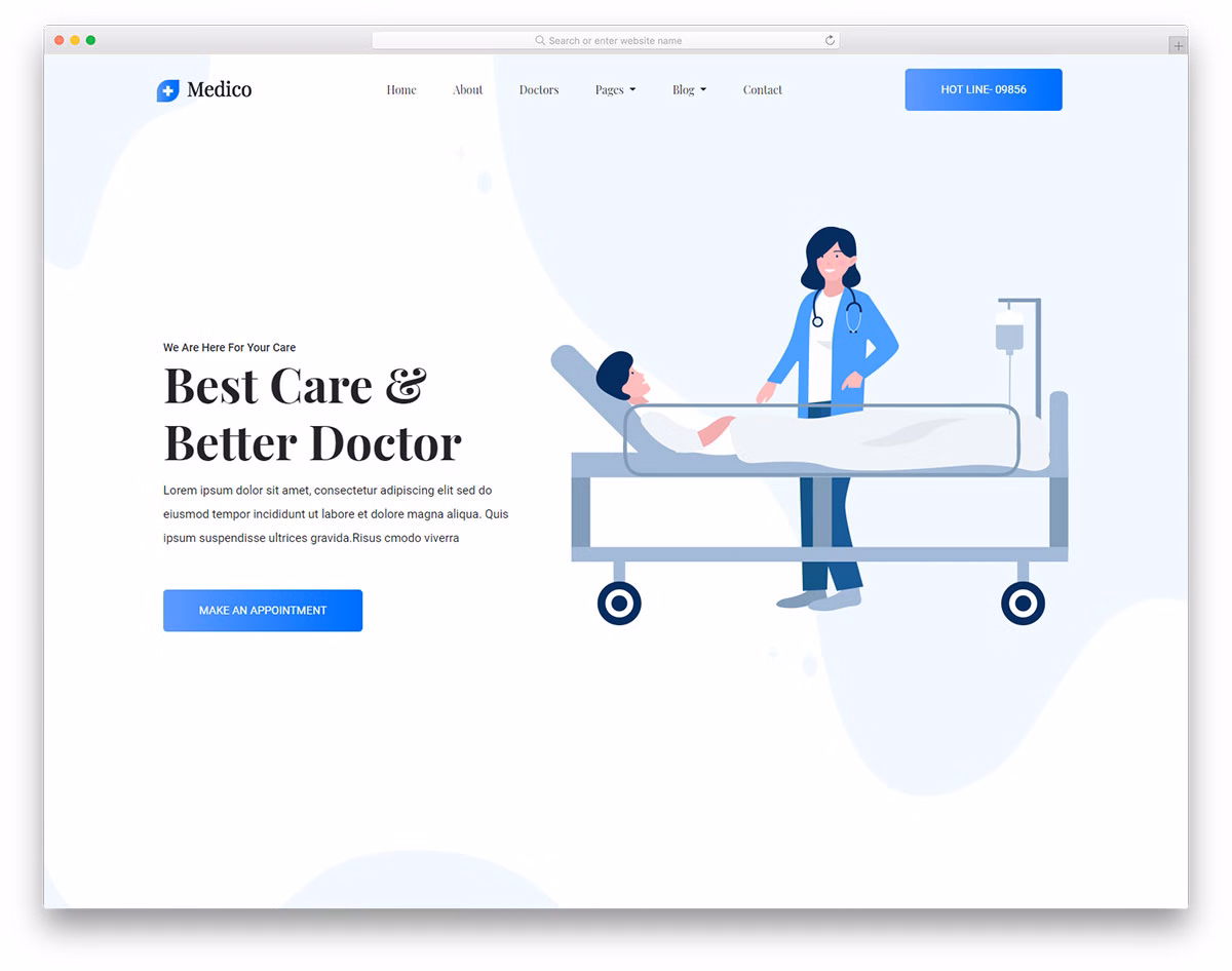 The web design of Medico is super clean, minimal, and modern. It comes with sticky navigation, call-to-action buttons, an online appointment form, and social media icons. Blog pages and contact sections with Google Maps and a working form are also integrated into the template. You will save yourself loads of time, yet still, create a professional and sophisticated page for all and any of your medical services.