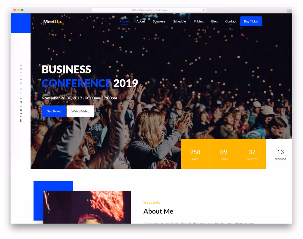Meetup is a wonderful, practical and easy to use one-page event website template. Of course, the site canvas is flexible enough to work with meetups, forums, conferences and other types of gatherings as well. Meetup has a striking web design that will spark everyone’s curiosity and help you win over even more attendees. Right off the bat, Meetup welcomes all your users with a neat full-screen slideshow and countdown timer. If this alone is the main convincing factor, they can go and purchase tickets right away (CTAs included).
