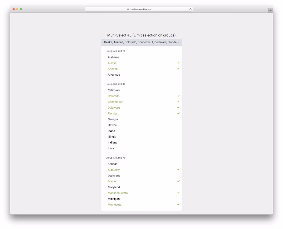 A highly flexible free limited group multiselect dropdown snippet that breaks things down very conveniently. The functionality and usability of this widget go over and beyond, allowing you to use it for anything.