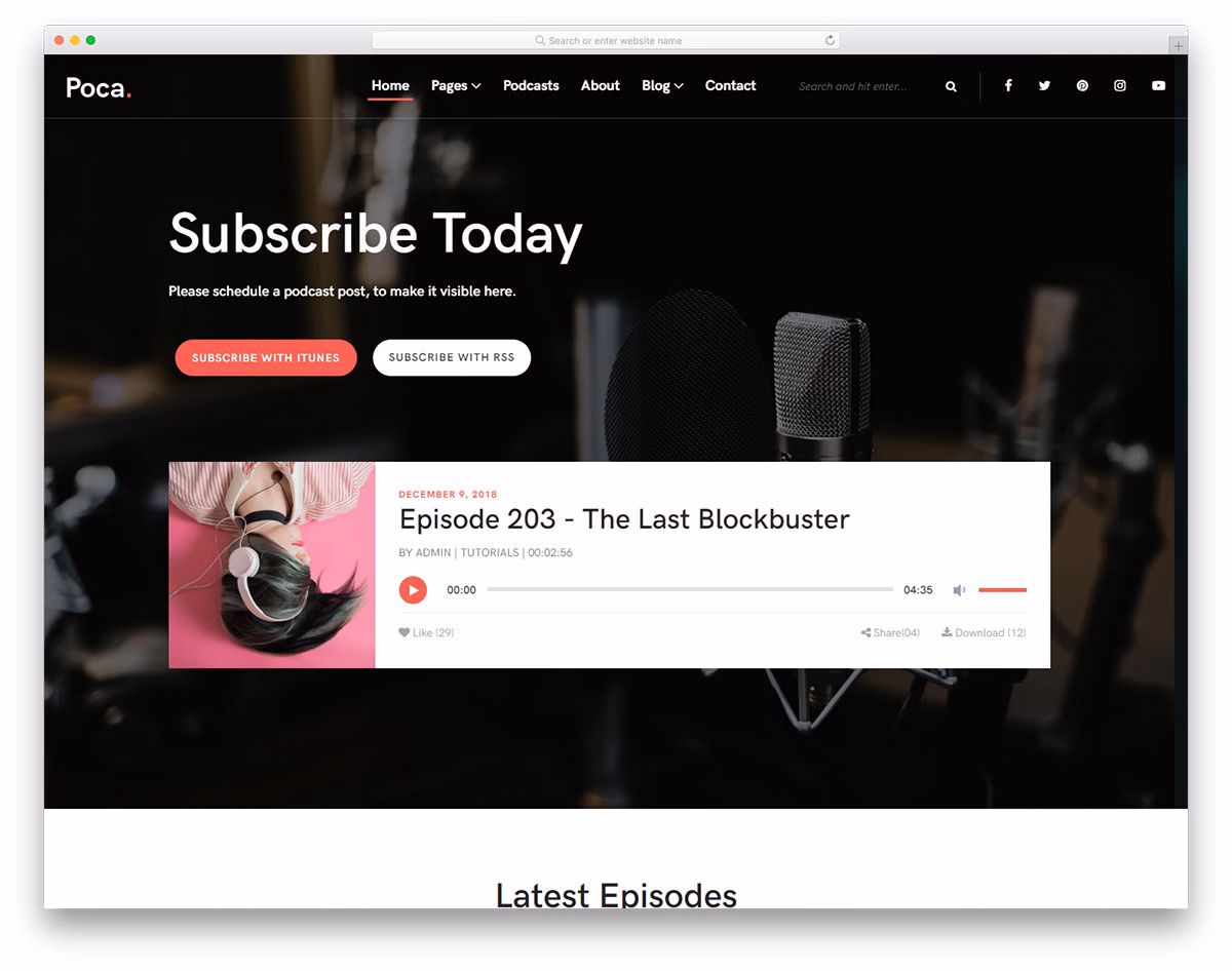 Poca is a fantastic, mobile-ready and responsive free podcasters website template with a nice selection of features and assets. If you are planning to start your own podcast show or you already run one but would like to establish a solid web presence, Poca is the solution for you. With the template, you can now easily hammer out the neatest, cleanest and most modern website that will take your podcasting project to new heights.