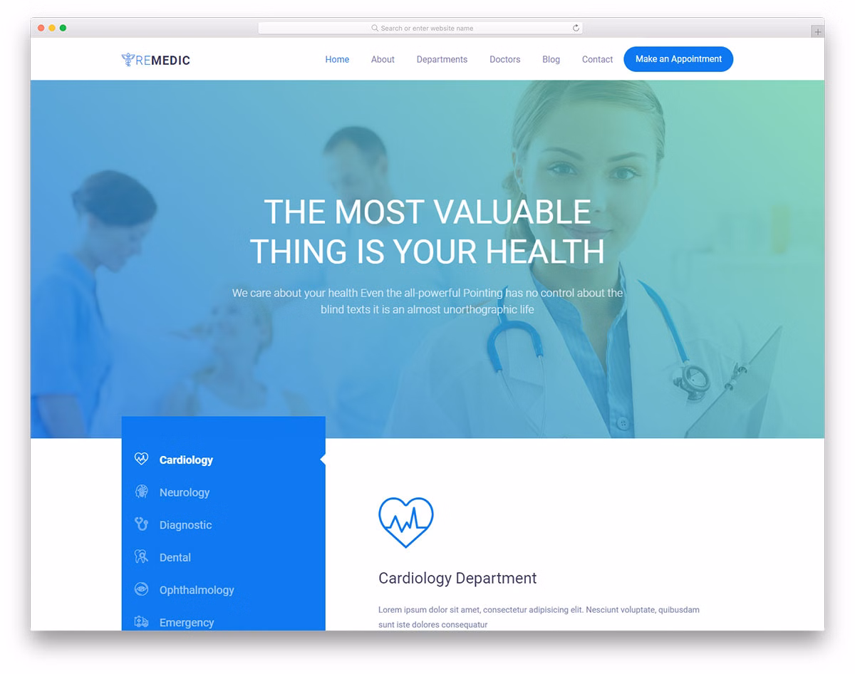 Remedic is a supreme and cutting-edge medical and hospital website template for you to expand your business reach and help more patients out. Once you download the HTML tool, you are not far away from launching a functional and active page anymore. Remedic has the most content prepared and ready-to-use for you to utilize and take to your advantage. Moreover, it is a responsive mobile-ready page canvas that works smoothly on all devices and browsers.