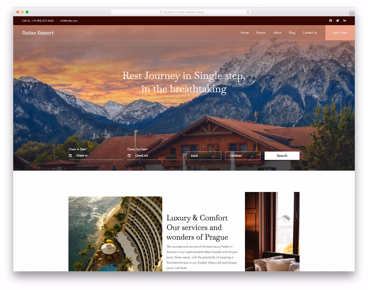 Other Rolax’s highlights are top bar, hover effects, social icons, floating navigation, room pages, video support and customer testimonials/reviews slider. There are also all the necessary blog pages if you would like to share additional information, activities, and more. Rolax is here to bring your resort online with a compelling website.
