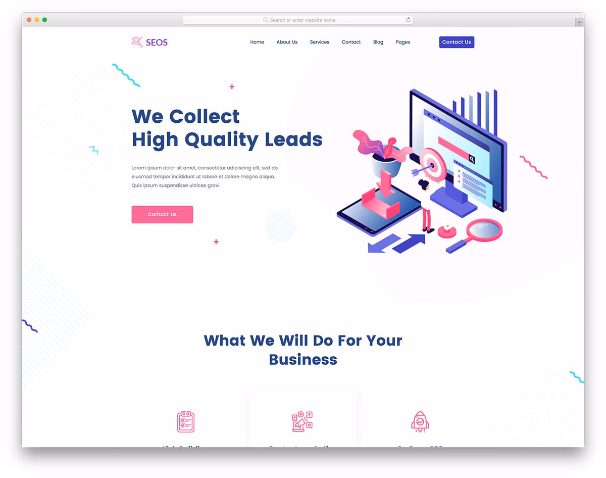Moreover, Seos is responsive and cross-browser-compatible. It operates on all devices like a dream, delivering a spectacular performance. Other treats with Seos are testimonials slider, back to top button, sticky menu, pricing plans and a fully functional contact page. Start online with a bang, thanks to Seos.