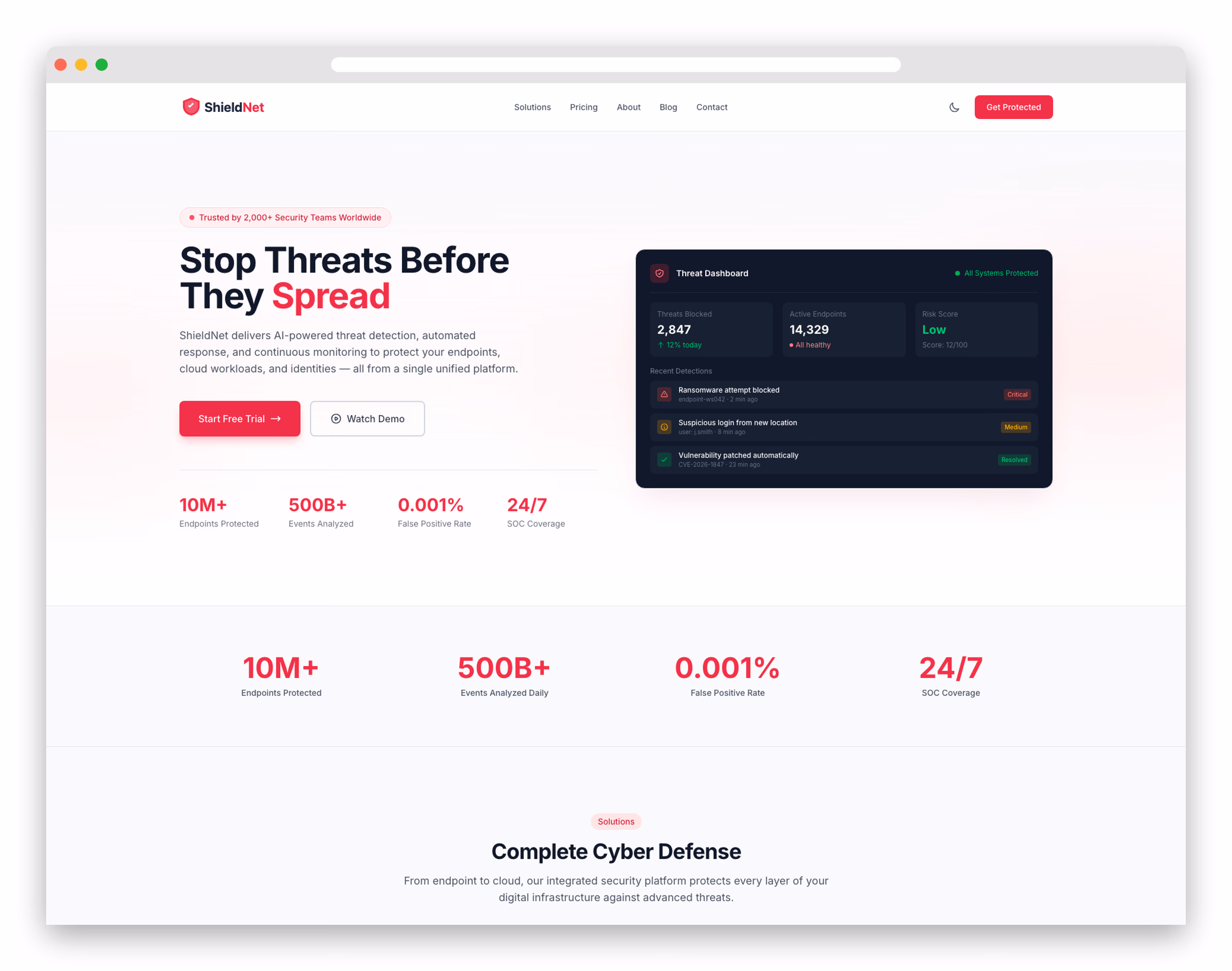 Built with Astro 6 and Tailwind CSS 4.x, ShieldNet delivers exceptional performance with lightning-fast page loads and a modern development experience. All content lives in simple YAML and Markdown files—edit text, reorder sections, or remove entire blocks without touching any code. The template includes a built-in blog with search and filtering, dark mode with persistent toggle, View Transitions for SPA-like navigation, and a fully responsive design that looks stunning on every device.