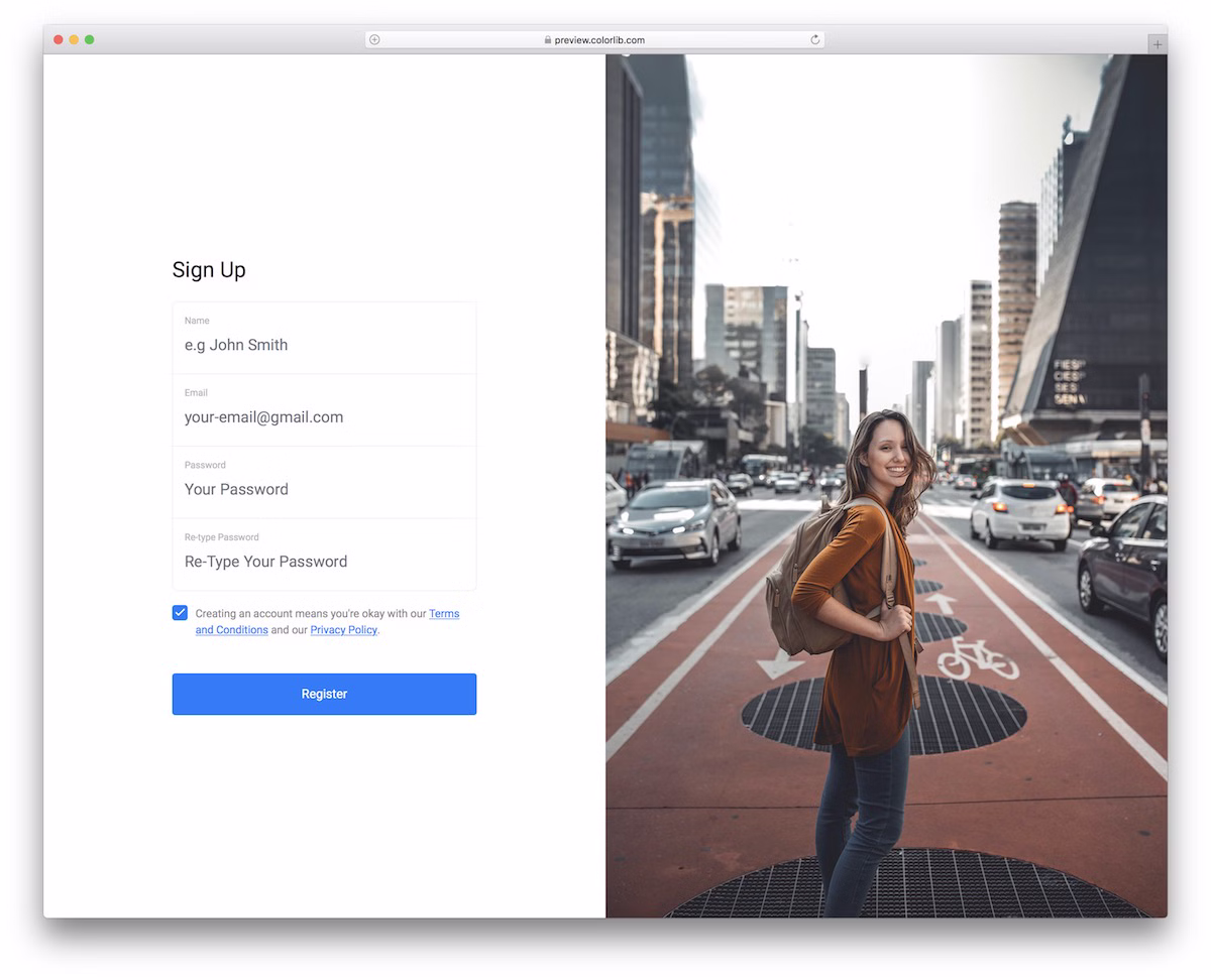 Template Details Author: Colorlib Released: 2025 License: CC BY 3.0 Description Add a sign-up section to your website with this convenient and easy to use free modern registration form template. It features a split-screen design, with the form on one side and an image on the other. Download Preview