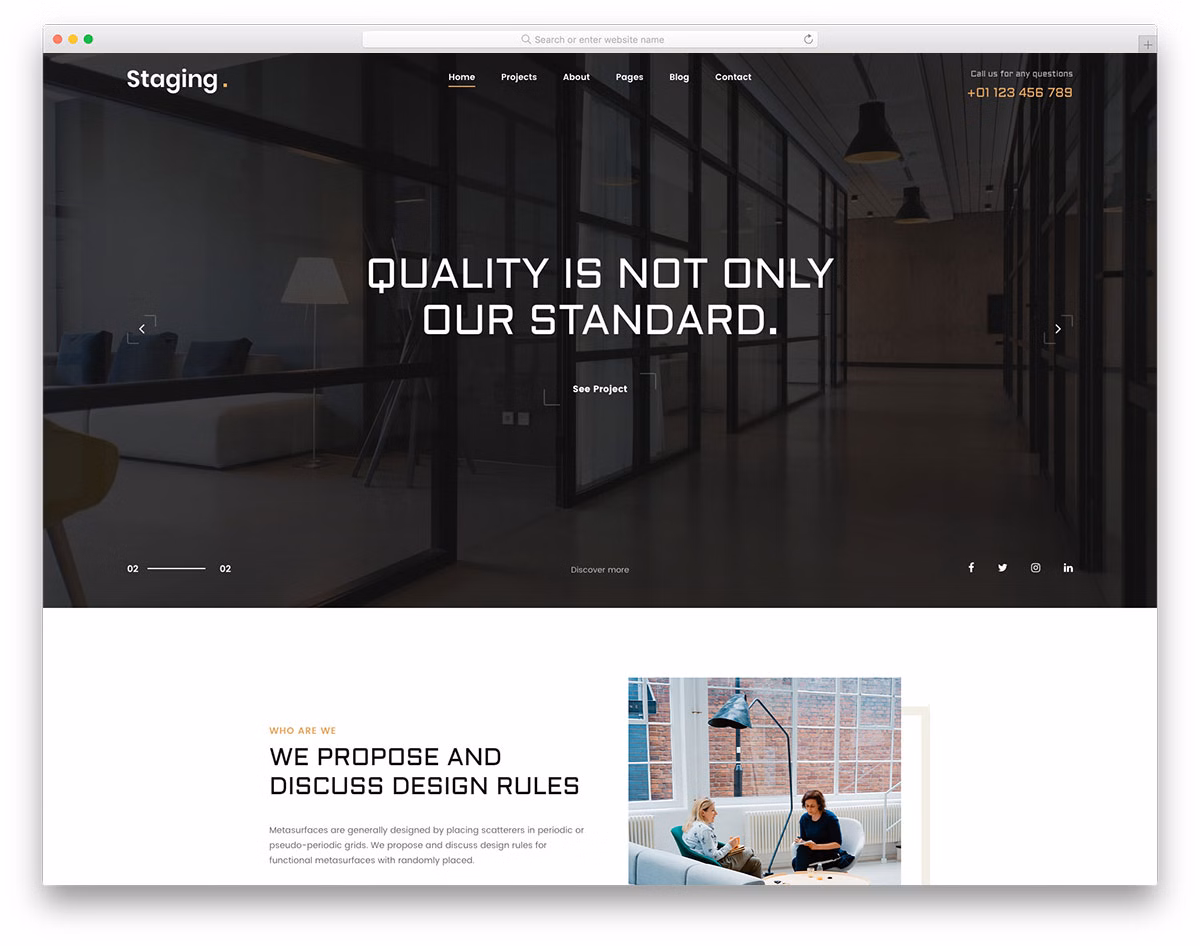 Speaking of features, Staging sports slideshow, CTAs, social media icons, testimonials, brand logo slider and animated stats, to name a few. Create a business-driven home interior website with Staging and reach new territories.