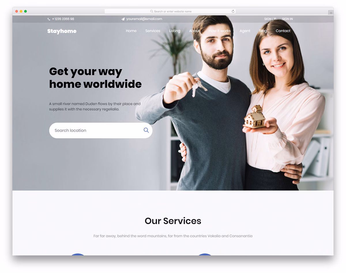 There is a massive banner with search function welcoming all your potential customers above the fold. A compelling image coupled with some text can easily intrigue them to learn more about your services and your realty. Other goodies of Stayhome include parallax effect, sticky menu, property slider, blog pages and testimonials. Working contact form and Google Maps are also in the kit for your convenience. A one-page website is all you need for your real estate agency, or even if you are a real estate agent, to attract new clients and grow your business accordingly.