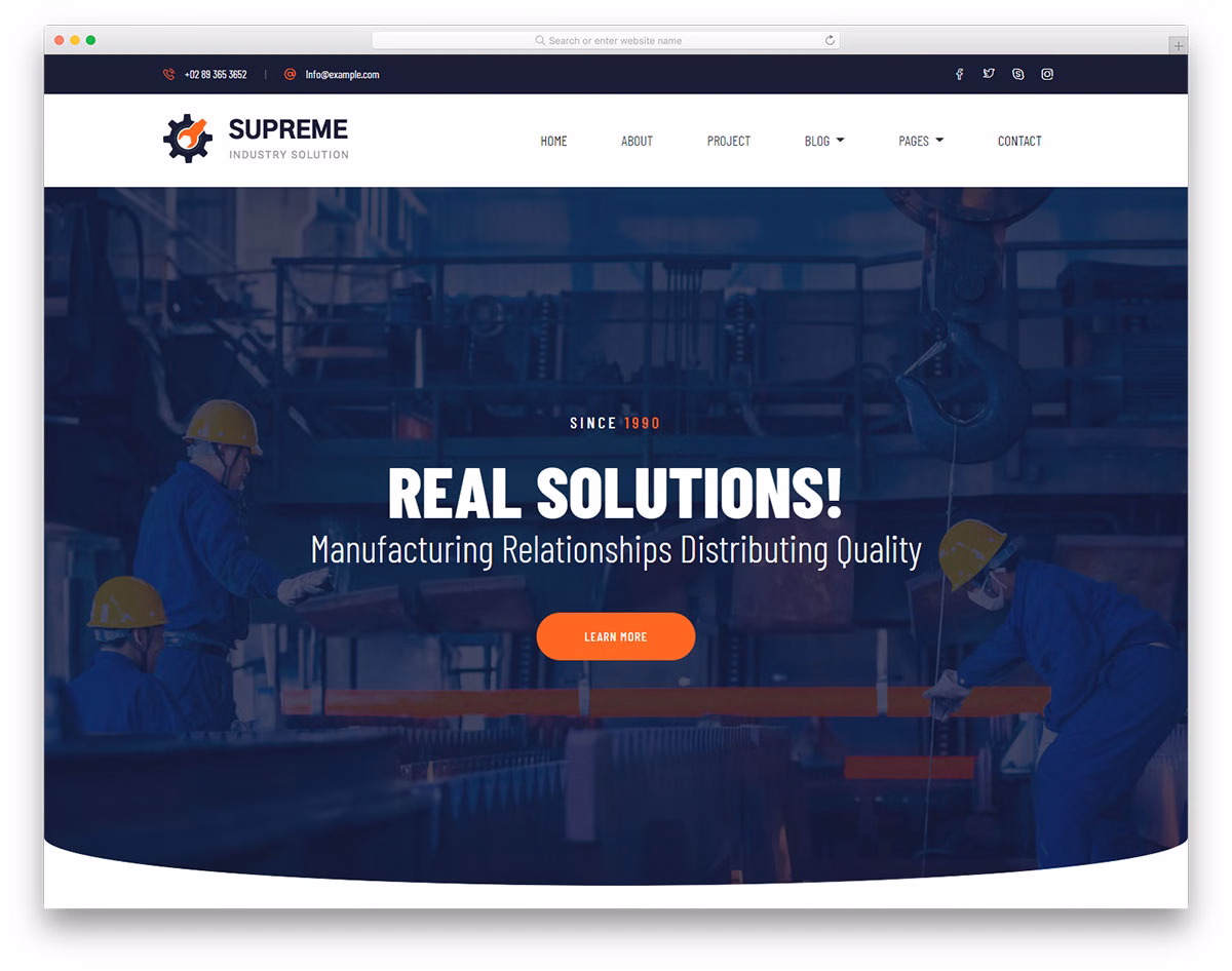 Also, Supreme comes with quite a bunch of features for you to put into play. From sticky navigation, call-to-action buttons and drop-down menu to hover effects, impressive projects section and working contact form, it is all there, packed in the Supreme bundle. There is a great chance you would want to use Supreme out of the box; however, tweaking this free manufacturing website template is possible, too.