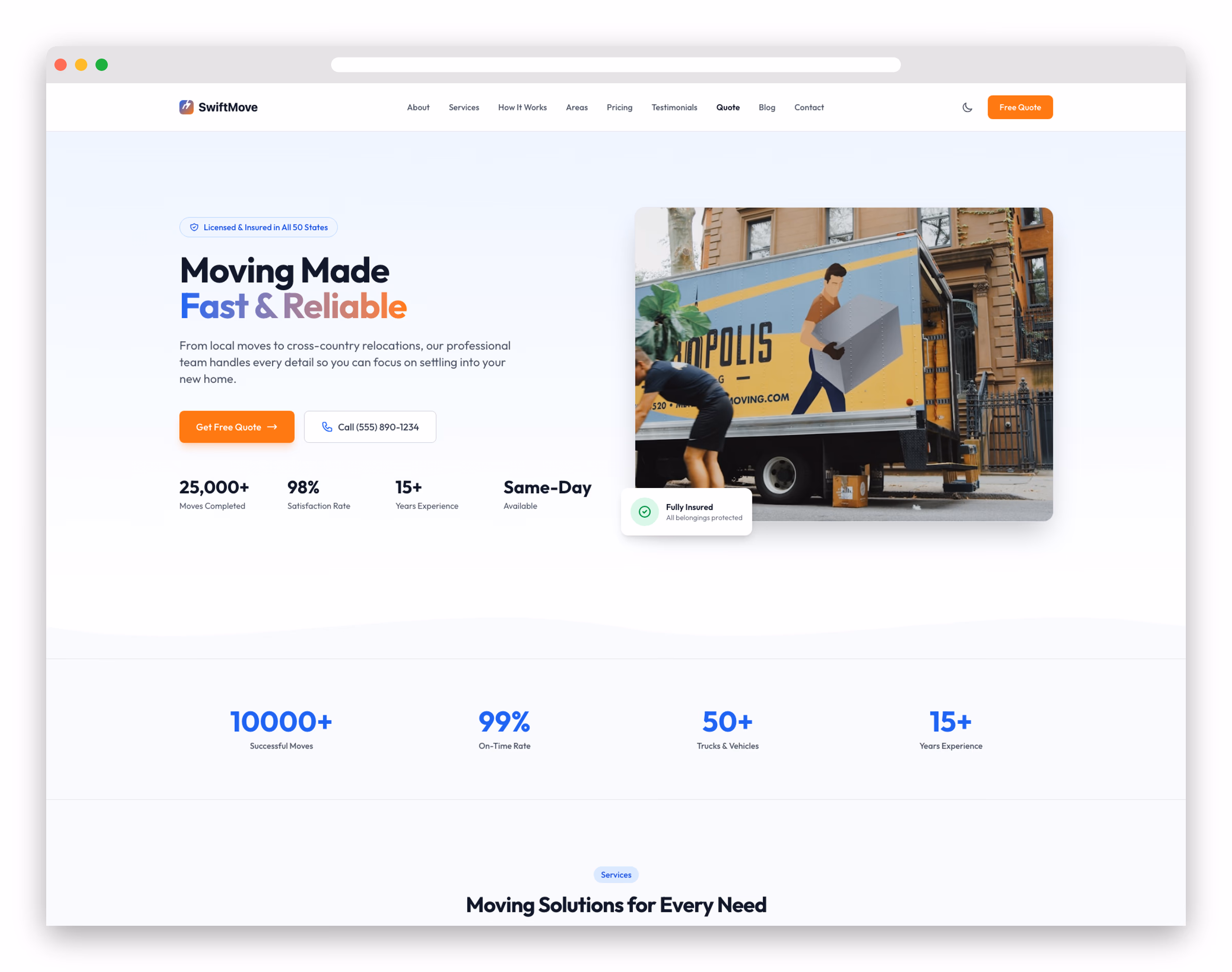 Moving is stressful enough without a confusing quote process. SwiftMove gets homeowners to a price estimate in under 60 seconds with an interactive quote calculator that factors in distance, home size, and services. Service breakdowns from packing to storage, fleet showcases, and real customer reviews build the confidence needed to hand over house keys to strangers. Service areas, pricing tiers, and moving tips are managed through YAML and Markdown—update your fleet info or publish seasonal moving guides without touching code.