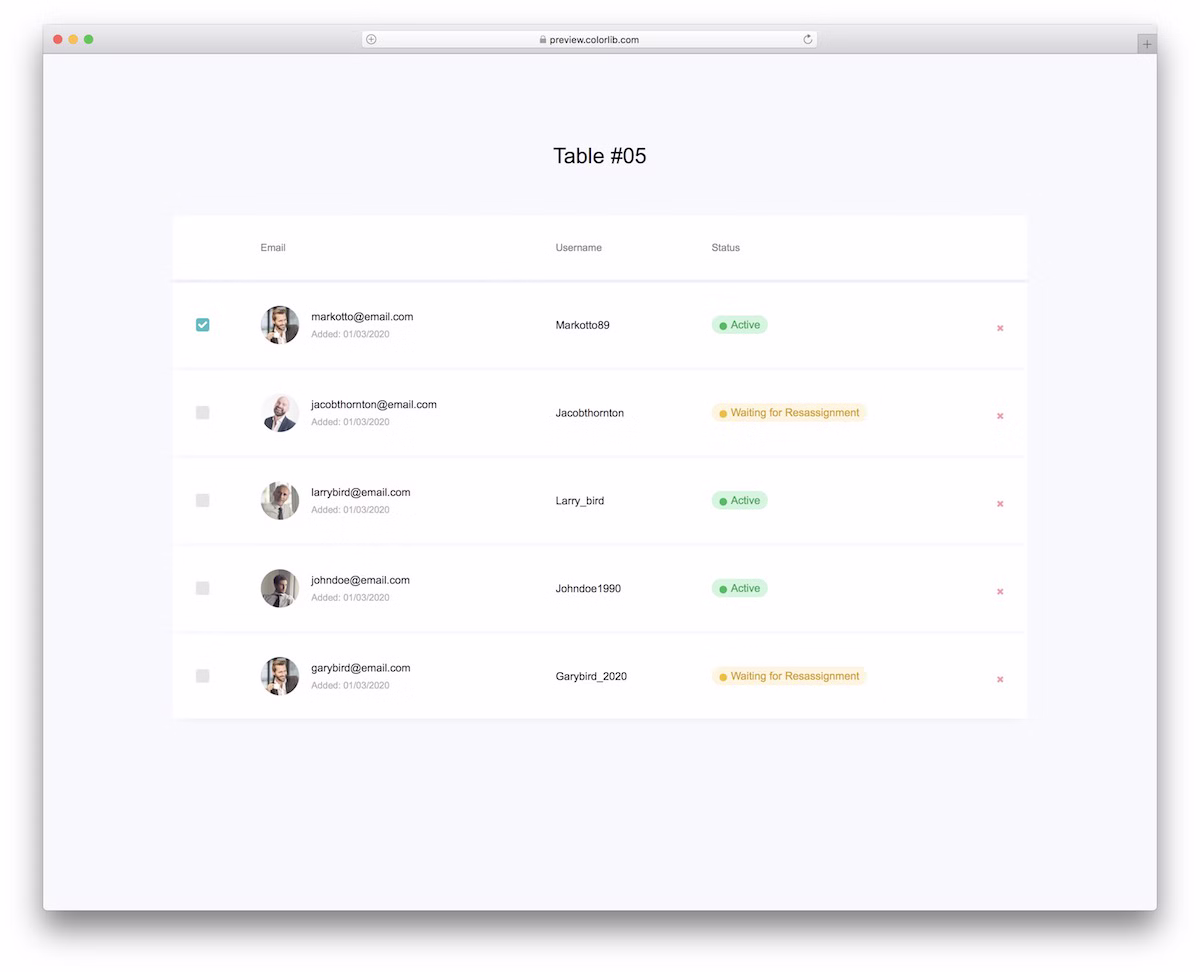 Template Details Author: Colorlib Released: 2025 License: CC BY 3.0 Description For your professional application, this free profile table template can come in extremely handy. It features checkboxes, an option to erase a profile and other neat goodies that will do you well. Download Preview