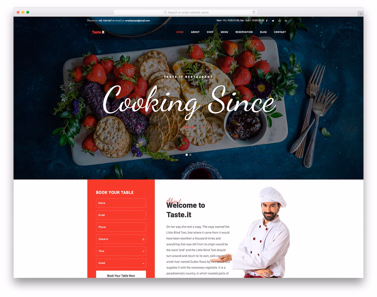 Moreover, the excellent features make this free template very premium-like. Full-screen slider, sticky navigation, social icons, food menu, testimonials, you name it, there is a lot in the Tasteit kit. Predefined reservation and contact forms, as well as Google Maps integration, are also part of the bundle.