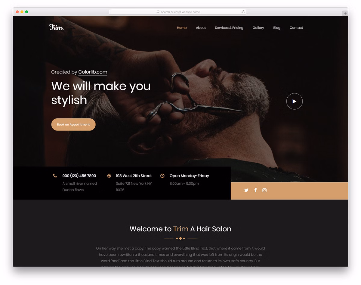 Trim is a free mobile-ready barbershop website template you can use to represent your business on the web. With a solid and cutting-edge internet presence, you can do a lot more for your barber shop than you think. Not only can you show your professionalism and market your irresistible services, but you can also automate appointments and have it all in perfect order. From now on, they won’t need to pick up a phone and start dialing. They can just fill out the form and that’s it.