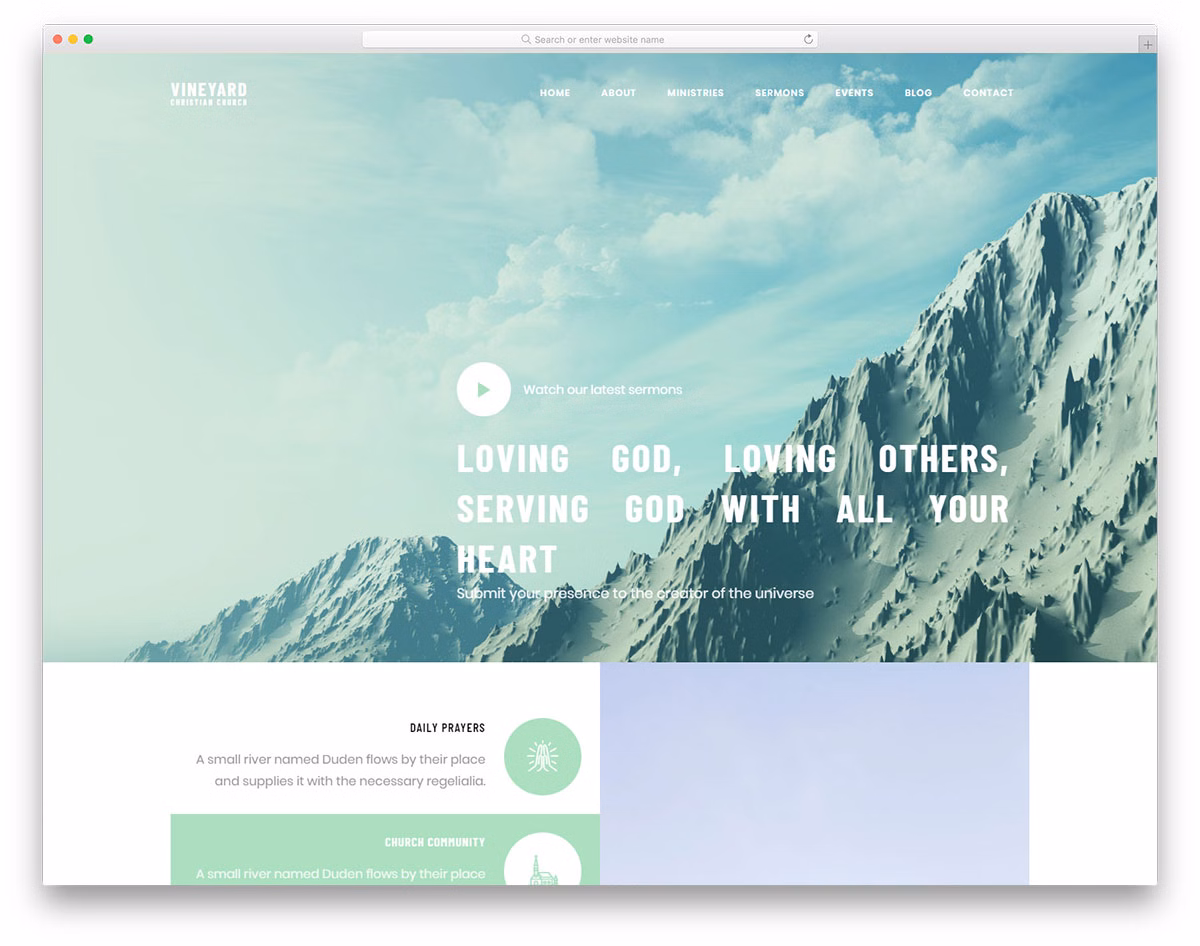Other goodies of this nifty site skin are scroll content load, hover effects, sticky navigation, sermons section, testimonials, and more. Vineyard also has page layouts for ministries, events, blogs, and contact. The latter contains Google Maps and a functional contact form, too.