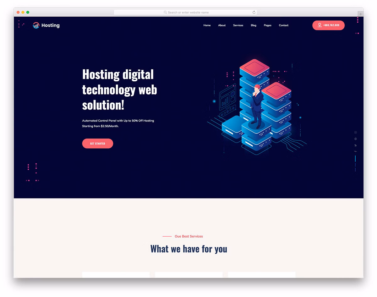 Moreover, WebHostingService guarantees stable page performance across all devices and platforms. It features a slider, sticky navigation, pricing, back to top button and a drop-down menu, to name a few. If you would like to start a blog and use it for content marketing, you also get the necessary predefined pages. For web hosting services, WebHostingService is your best bet.