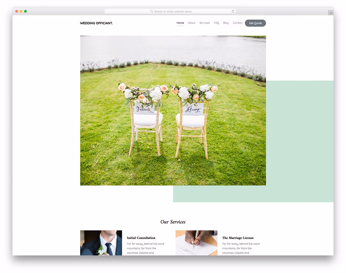 Wedding Officiant follows all the latest web and tech trends. Your page will operate flawlessly on all modern devices, web browsers and retina screens. This site canvas is also lightweight and easy to use, offering everyone to get the most out of it. Start on the internet like a pro with Wedding Officiant.