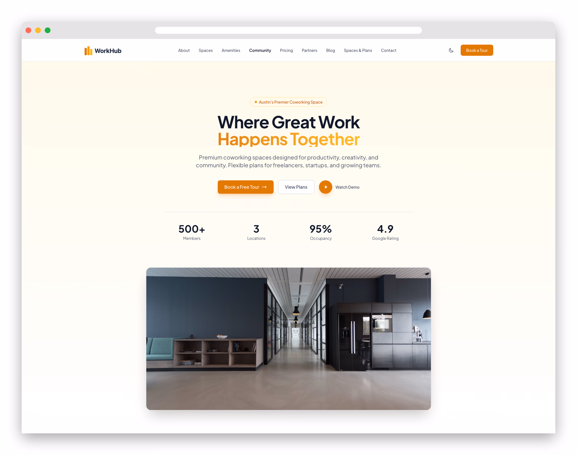 Remote workers and startups choose coworking spaces based on vibe, amenities, and pricing transparency. WorkHub delivers all three through virtual space tours, desk/office comparisons, and clear membership tiers. Community event calendars and member testimonials sell the networking value that justifies premium pricing over working from home. Membership plans, event listings, and community spotlights are managed through YAML and Markdown—keep your space page fresh without a developer on call.