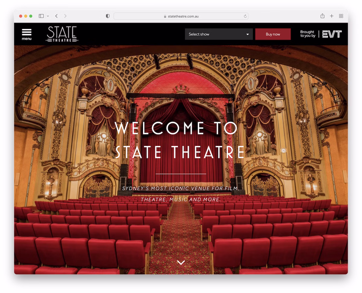 State Theatre website gives you a welcoming feel with its full-screen image slider. They have one of the most practical header sections that opens a sidebar menu on click and allows you to purchase show tickets with the handy drop-down.