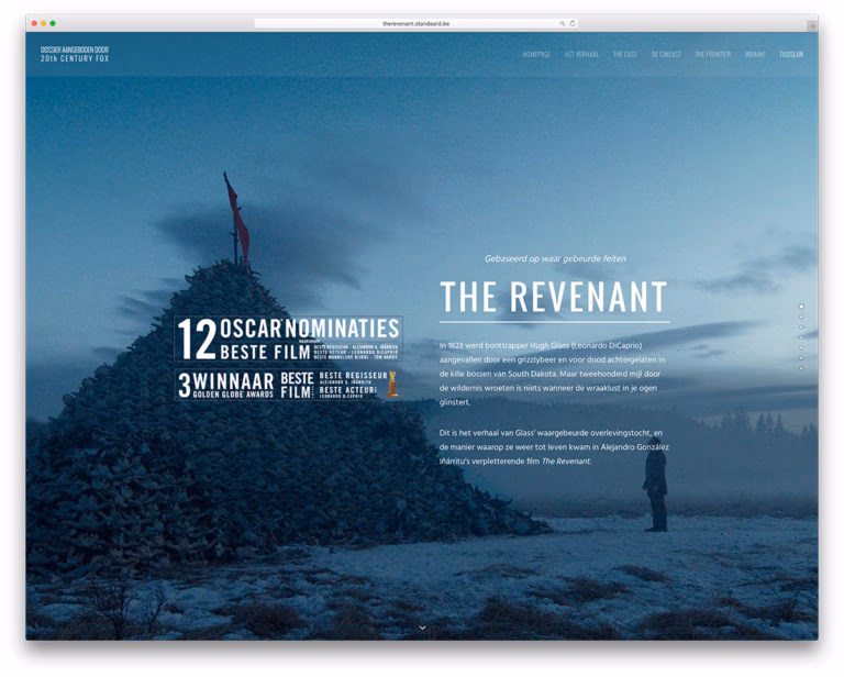 This is the Dutch website of the movie ‘The Revenant’, which bagged 3 Oscar awards in 2016. The website sports full-screen images from the film on a slider. If you wish to watch its trailer, you can do so by clicking on the YouTube video embedded in one of the horizontal sections. To understand the story better and to have a context of the period in which it occurred, you can access the timeline regarding fur hunting in America from the header. The website also puts 11 images on a separate page in a slider.