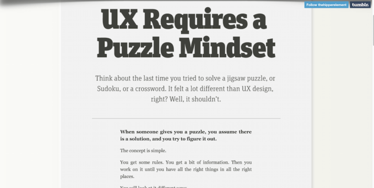This is a nice little inspirational snippet about the UX design puzzle approach. It comes back to what we have talked about before: the need to establish a design UX that resembles the UI. Both of these can work together to achieve the desired design result. Perhaps a little overtoned, but valid advice and something to pin on a wall when doing UX design yourself.