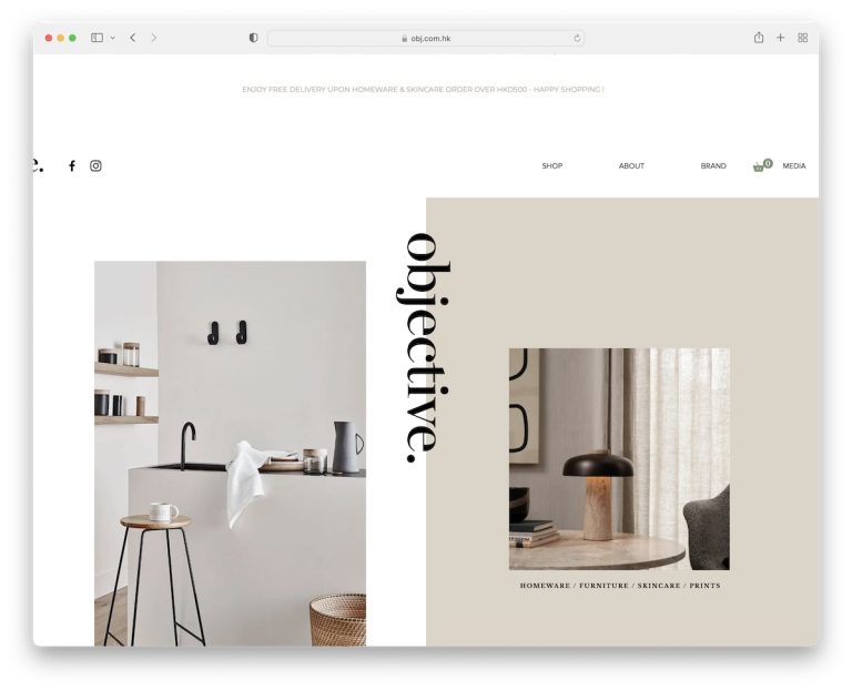 Eye-catching animated thumbnails add a dynamic touch, while the innovative, vertically written “Objective” floating button serves both as a unique brand statement and a practical back-to-top function.
