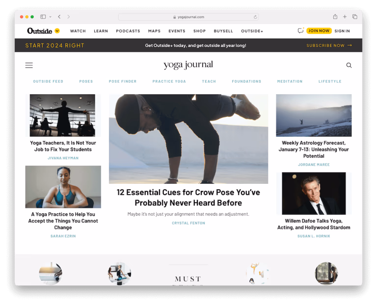 Yoga Journal is a premier wellness website with a light magazine-style design that embodies tranquility and mindfulness.