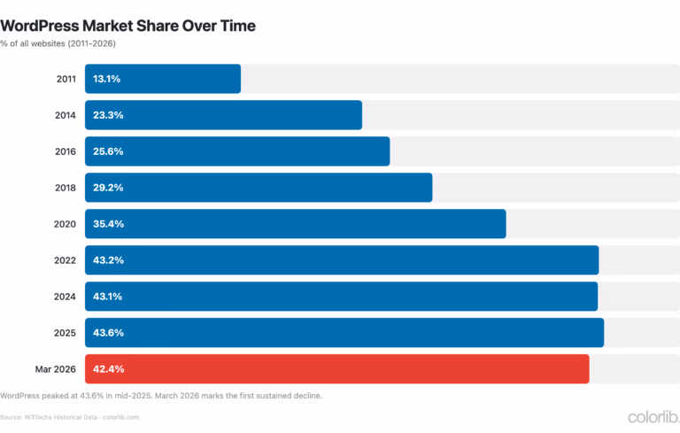 - 42.6% of all websites run WordPress — down from 43.6% peak in mid-2025 (W3Techs)