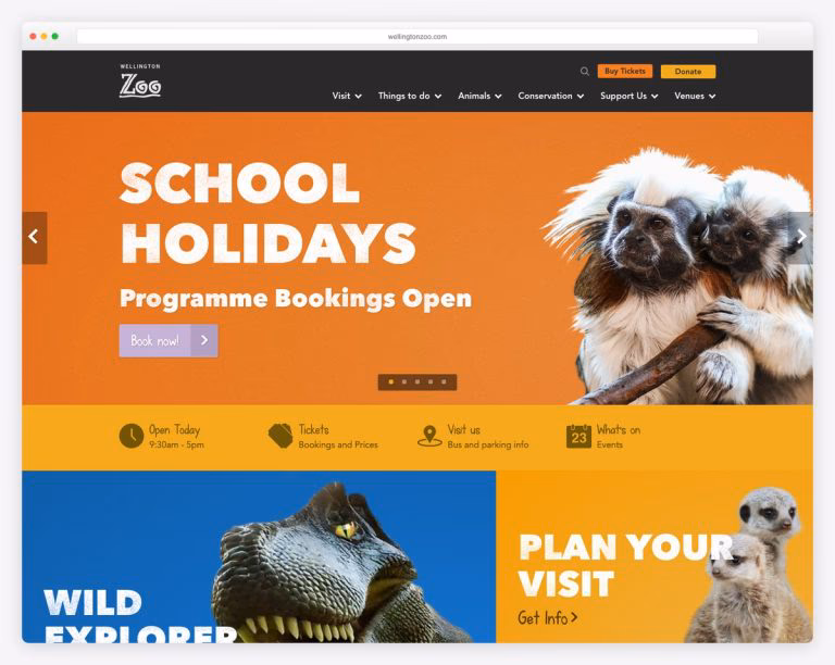 A zoo provides a fun and exciting educational resource. Typically, it’s an excellent way to engage children in science. So, getting your brand as a zoo business to the web is a great scheme. Here’s a bunch of zoo websites to delve into. Wellington Zoo is New Zealand’s first zoo and Wellington’s oldest conservation organization, caring for animals since 1906. The website design is impressive, with vivid web elements added to the homepage. The contents are placed in tiles with bold and attractive typography, quality images, and colorful backgrounds. While the header reveals useful components, the footer corresponds to it with useful links added. Also, this zoo website displays Instagram feed in grids nicely.